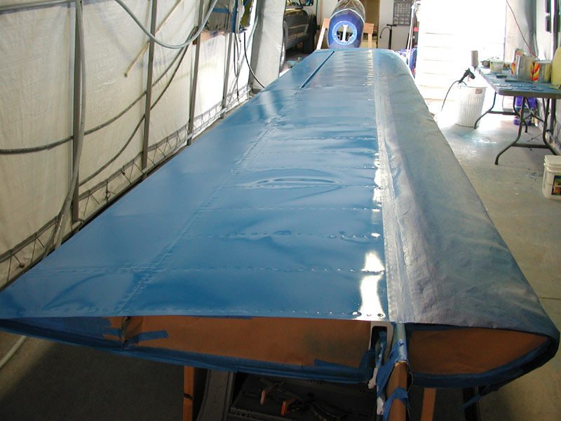 | Below - the dark blue goes on, this is the tack coat. I wait 20 minutes between coats to prevent running on the leading edge. |