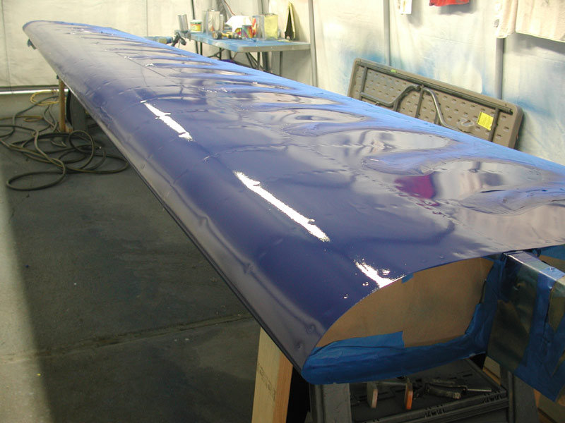 | Below - May 14, 2005, I mask off the finally finished leading edge and wet-sand the Bahama Blue aft spar surface in preparation for a final coat. Just prior to painting, I've learned that the only preparation required to shoot Polytone is to wet-sand the surface with 600 - no paint cleaning solvent or other cleaners and a quick wipe with a tack rag. |