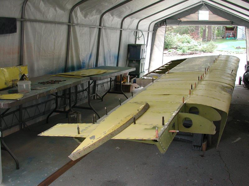 | Above April 2, 2005 - the left wing goes out to the trailer and the right wing is in the shop to get all new leading edge skins and fabric. After I finish this wing, I'll paint them both in the Polytone finish colors. |