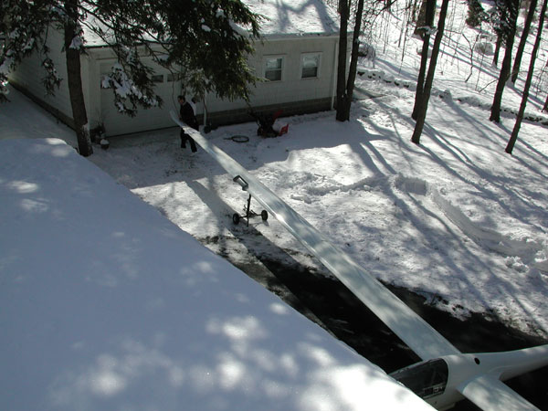 | Rebecca suggested we rig the glider in this position, Dave and I were trying to make it fit a different way - it would not have fit without a lot more snow removal. Nice to have friends with acreage when you own a Nimbus. |