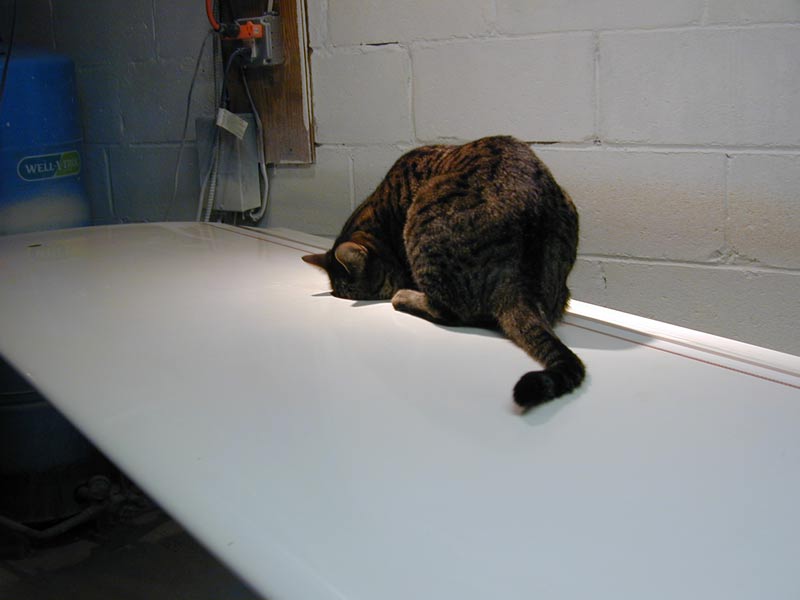 | While trying to install a bolt on the aileron drive, I dropped a shiny stainless steel washer in the wing and the Tabby Cat believes that he can retrieve it. He's got one forearm all the way in and part of his head. He's determined! |