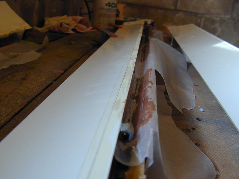 | The last weights are epoxied in place and now I've formed the epoxy fillets and wrapped them in wax paper to form a smooth finish. Next step is to sand down the lower surfaces of the ailerons and spray on a coat of 2781. |